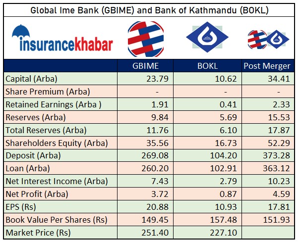 त्यस्तै संचित मुनाफा सहित ग्लोबल आइएमईको जगेडामा ११ अर्ब ७६ करोड रहेको छ भने बैंक अफ काठमाण्डूको जगेडामा ६ अर्ब १० करोड संचित छ । मर्जर पश्चात बन्ने बैंकको जगेडामा १७ अर्ब ८७ करोड हुने छ। त्यस्तै मर्जर पश्चात दुई बैंकको पुँजीकोष ५२ अर्ब २९ करोड हुने छ ।