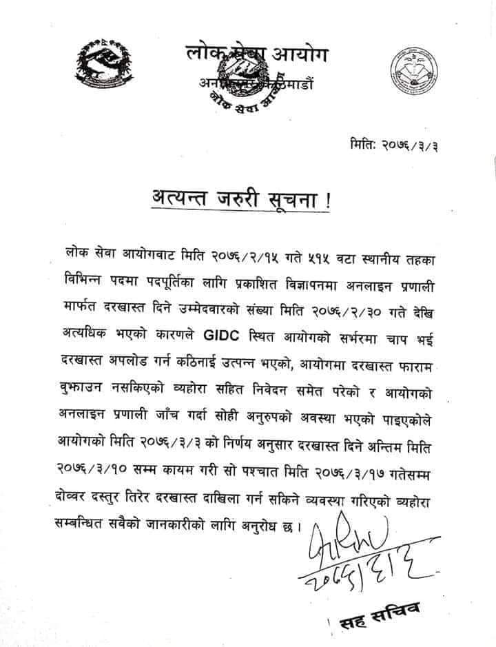 लोक सेवा आयोगले आफ्नो अनलाइन फारम भर्ने समय १ हप्ता थप गरेको छ। समय थप गर्दै लोक सेवा आयोगले असार १० गते सम्म विद्यार्थीहरुले सिङ्गल दस्तुरमा अनलाईन फर्म भर्न सक्ने र दोब्वर दस्तुरमा असार १७ गते सम्ममा फर्म भर्ने व्यबस्था मिलाएको छ ।