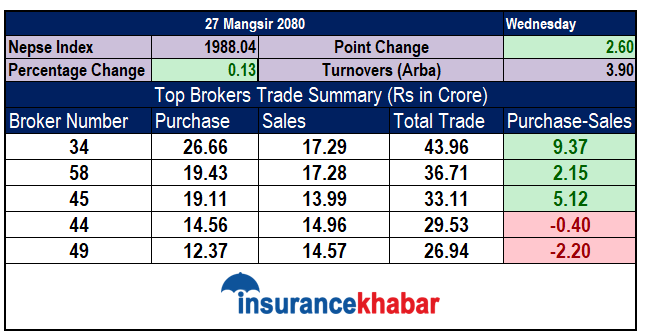 बुधवार ३ अर्ब ९० करोडको कारोबार भएकोमा ब्रोकर नम्बर ३४बाट सर्वाधिक रकमको कारोबार भएको छ । ब्रोकर नम्बर ३४बाट २६ करोड ६६ लाखको खरीद हुँदा १७ करोड २९ लाखको विक्री भएको छ । त्यस्तै दोश्रोमा ब्रोकर नम्बर ५८ बाट १९ करोड ४३ लाखको खरीद हुँदा १७ करोड २८ लाखको विक्री भएको छ ।