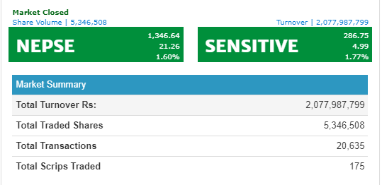 आज दिनभरिमा १ सय ७५ कम्पनीको ५३ लाख ४६ हजार ५ सय ८ कित्ता शेयर २० हजार ६ सय ३५ पटक खरिदविक्री हुँदा २ अर्ब ७ करोड ७९ लाख ७७ हजार रुपैयाो कारोबार भएको छ । सबैभन्दा धेरै सूर्या लाइफ इन्स्योरेन्स कम्पनी लिमिटेडको १० करोड ११ लाख रुपैयाँको कारोबार भएको छ ।