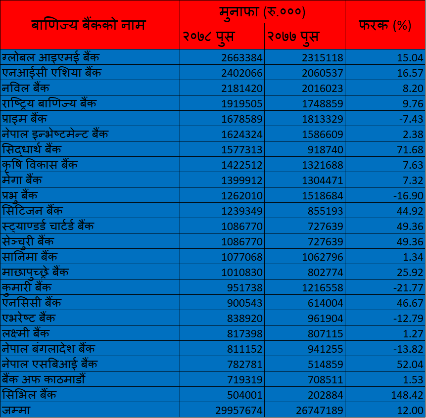 काठमाडौं । चालु आर्थिक वर्षको दोस्रो त्रैमाशिक अवधिमा २३ बाणिज्य बैंकको मुनाफा ३ अर्ब २१ करोड रुपैयाँले बढाएका छन् । बाणिज्य बैंकहरुले १२ प्रतिशतले मुनाफा सुधार गर्दा ५ बैंकको भने घटेको छ । मुनाफामा प्राय सधै पहिलो नम्बरमा हुने नविल बैंकलाई यस पटक एनआईसी एशिया बैंकले उछिनेको छ । मर्जरबाट सिनर्जी पाएको ग्लोबल आइएमई बैंक मुनाफामा सर्वाधिक अगाडी रहेको छ । ग्लोबल आइएमईले १२ प्रतिशतले मुनाफा बढाउदै २ अर्ब ६६ करोड रुपैयाँ आर्जन गर्न सफल भएको छ । दोस्रोमा रहेको एनआईसी एशियाले १६ प्रतिशतले मुनाफा बढाउदै ६ महिनाको अवधिमा २ अर्ब ४० करोड रुपैयाँ आर्जन गरेको छ ।