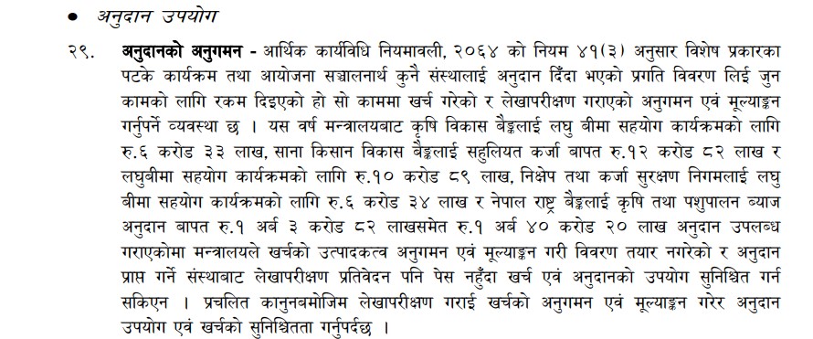 महालेखाको प्रतिवेदनमा भनिएको छ, ‘नेपाल राष्ट्र बैंकलाई कृषि तथा पशुपालन अनुदान बापत एक अर्ब ३ करोड ८२ लख समेत रु एक अर्ब ४ करोड २० लाख रुपैयाँ अनुदान उपलब्ध गराएकोमा मन्त्रालयले खर्चको उत्पादकत्व अनुगमन एवम् मूल्याङ्कन गरी विवरण तयार नगरेको र अनुदान प्राप्त गर्ने संस्थाबाट लेखा परिक्षण प्रतिवेदन पनि पेश नभएको हुँदा खर्च एवम् अनुदानको उपयोग सुनिश्चित गर्न सकिएन । प्रचलित कानुन बमोजिम लेखा परिक्षण गराई खर्चको अनुगमन एवम् मूल्याङ्कन गरेर अनुदान उपयोग एवम् खर्चको सुनिश्चितता गर्नुपर्दछ ।’