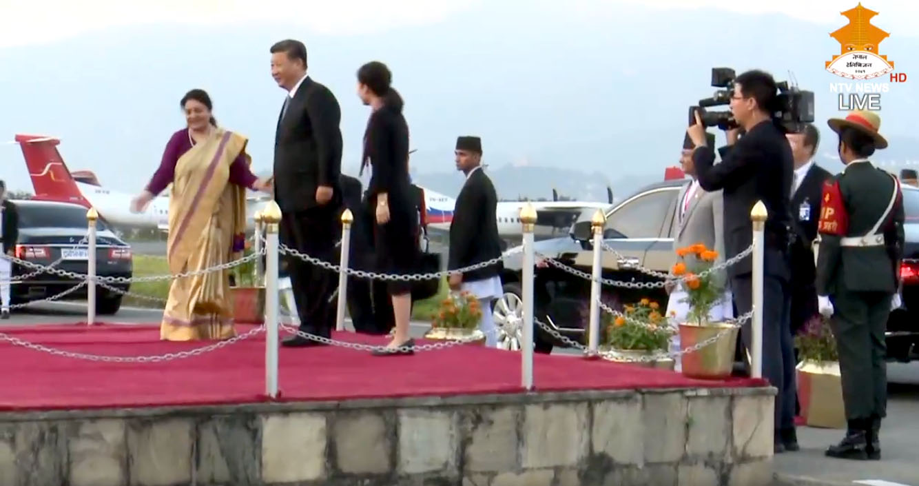 काठमाडौं । जनगणतन्त्र चीनका राष्ट्रपति सी जिनपिङ दुई दिने राजकीय भ्रमणको क्रममा शनिबार अपरान्ह काठमाडौंमा अवतरण गरेका छन् । सीलाई राष्ट्रपति विद्यादेवी भण्डारी आफै विमानस्थल पुगेर स्वागत गरेकी छिन् । त्यस्तै प्रधानमन्त्री केपी शर्मा ओली समेत विमानस्थल पुगेर स्वागत गरेका छन् ।
