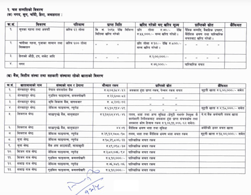 अनियमितताको आरोप खेपेका श्रेष्ठको सम्पत्ति विवरण एक अनलाईनले सार्वजनिक गरेको छ । २०७२ साल चैत्र ५ गते नेपाल राष्ट्र बैंकमा बुझाएको सम्पत्ति विवरणमा उल्लेख भएका बाहेक हाल उनीसँग कति सम्पत्ति छ र ? यस अवधीमा कति सम्पत्ति बृद्धि भएको छ भन्ने कुरा खुल्न बाँकी छ ।
