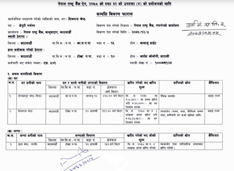 ४ वर्षअघि ८५ हजार रुपैयाँको मोटरसाइकल किस्तामा खरिद गरेका उनै शिवराज श्रेष्ठ यतिबेला डेपुटी गभर्नर छन् र उनीमाथि अनियमितताको आरोप लागेको छ । उनको खातामा एक करोड ८० लाख रुपैयाँ बचत रहेको श्रेष्ठ आफैले बुझाएको सम्पत्ति विवरणमा उल्लेख छ ।