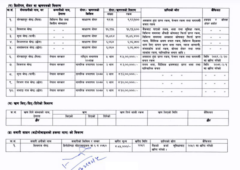 त्यस्तै, श्रेष्ठको सम्पत्तिमा ९० लाख ९१ हजार ४०० को विभिन्न कम्पनीका शेयर तथा राष्ट्रिय–नागरिक बचतपत्र खरिद गरेको उल्लेख गरेका छन् । विभिन्न कम्पनीहरुका ५५ लाख मूल्यका शेयर आफू, श्रीमती मुना श्रेष्ठ तथा छोराछोरीको नाममा खरिद गरेको उनको सम्पत्ति विवरणमा उल्लेख छ । सो शेयरको बजार मूल्य अहिले डेढ करोडभन्दा माथि रहेको बताइन्छ ।