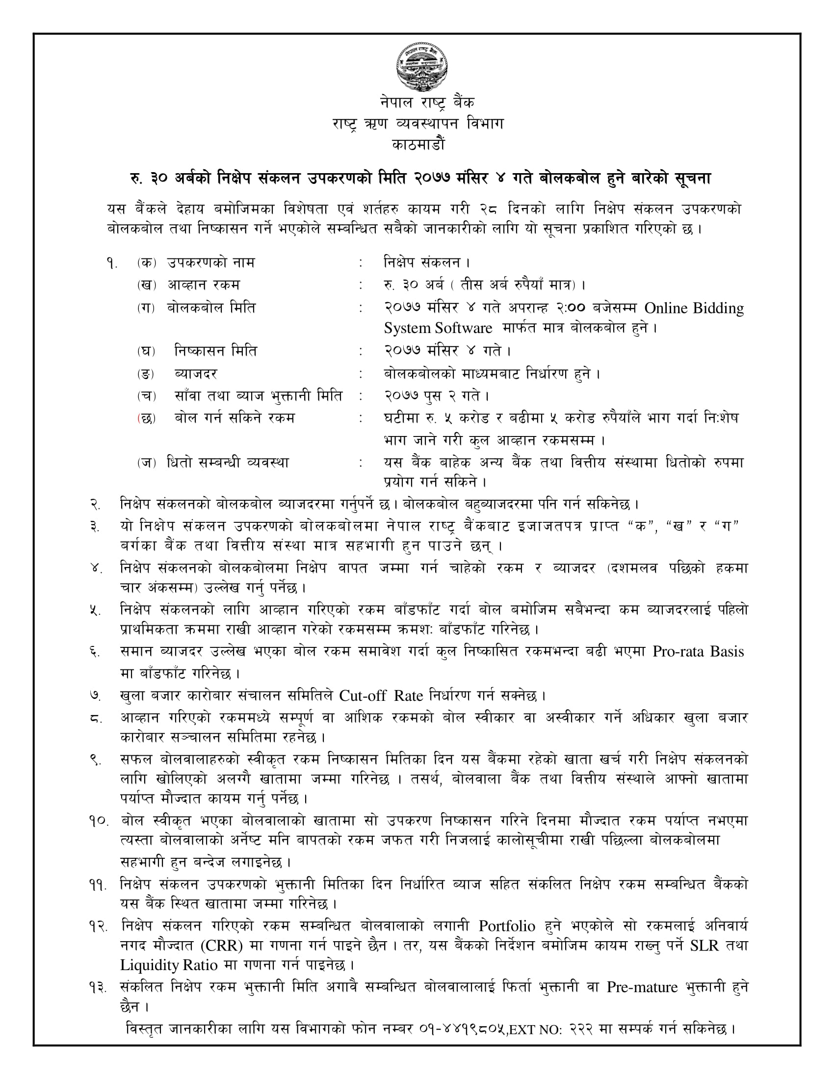 काठमाडौं । नेपाल राष्ट्र बैंकले ३० अर्ब रूपैयाँ बराबरको निक्षेप संकलन उपकरण निष्काशन गर्ने भएको छ । बैंकले २८ दिनको अवधिको लागि निक्षेप संकलन उपकरण निष्काशन गर्न लागेको एक सूचना मार्फत् जानकारी दिएको छ ।