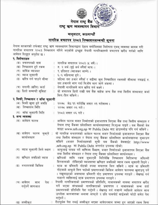 राष्ट्र बैंकले ९ प्रतिशत ब्याजदरमा आज जेठ ११ गतेदेखि असार १ गतेसम्मका लागि नागरिक बचतपत्र २०८३ बिक्री खुल्ला गरेको हो ।