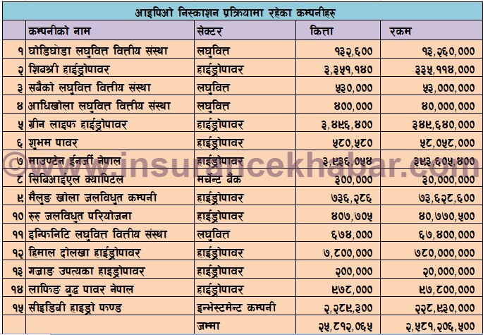 घोडिघोडा लघुवित्तको १ लाख ३२ हजार कित्ता, शिब श्री हाईड्रोपावरको ३३ लाख ५१ हजार कित्ता, सबैको लघुवित्तको ५ लाख ३० हजार कित्ता, आधिखोला लघुवित्तको ४ लाख कित्ता, ग्रीन लाइफ हाइड्रोपावरको ३४ लाख ९६ हजार कित्ता, शुभम पावर हाइड्रोपावको ५ लाख ८०  हजार कित्ता, माउण्टेन इनर्जी नेपालको ३९ लाख ३६ हजार कित्ता, सिबिआईएल क्यापिटलको ३ लाख कित्ता, मैलुङ खोला जलविधुत कम्पनीको ७ लाख ३६ हजार कित्ता, रुरु जलविधुत परियोजना हाइड्रोपावरको ४ लाख ७ हजार कित्ता, इन्फिनिटि लघुवित्त वित्तीय संस्था लघुवित्तको ६ लाख ७४ हजार कित्ता, हिमाल दोलखा हाईड्रोपावरकोे ७८ लाख कित्ता, गर्जाङ उपत्यका हाइड्रोपावरको २ लाख कित्ता, लाफिङ बुद्ध पावर नेपालको ९ लाख ७८ हजार कित्ता र सीइडिबी हाइड्रो फण्डको २२ लाख ८९ हजार कित्ता शेयर सर्बसाधरणलाई  निष्काशन गर्ने प्रक्रियामा रहेका छन ।