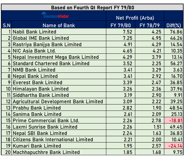 आर्थिक वर्ष ७९/८० को चौथो त्रैमासको वित्तीय विवरण अनुसार नबिल बैंकले सर्वाधिक ७ अर्ब ५२ करोड खुद नाफा गरेको छ भने दोश्रोमा ग्लोबल आइएमई बैंकले ७ अर्ब २५ करोड नाफा कमाएको छ ।