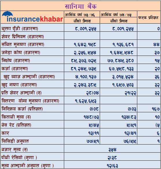 ८ अर्ब रुपैयाँ चुक्ता पूँजी भएको सानिमा बैंकले आर्थिक वर्ष २०७५/७६ को चौथो त्रैमाससम्ममा २ अर्ब २४ करोड रुपैयाँ खुद नाफा कमाएको छ । गत आर्थिक वर्षको सोही अवधिमा बैंकले १ अर्ब ६९ करोड रुपैयाँ खुद नाफा कमाएको थियो । गत आर्थिक वर्षको सोही अवधिको तुलनामा बैंकको नाफा ३२ प्रतिशतले बढी हो ।