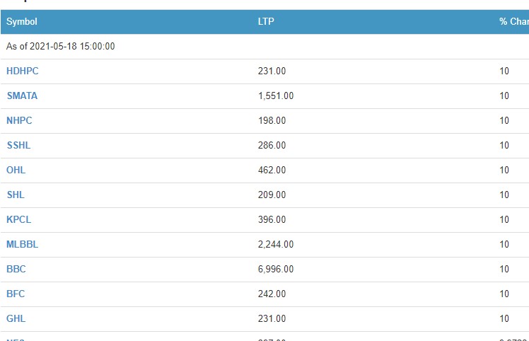 आज कुल ३४ कम्पनीको शेयरमा सकारात्मक सर्किट लागेको छ। त्यस्तै,११ कम्पनीको शेयर १० प्रतिशतको दरले बढेको छ । घलेम्दी हाइंड्रोपावर, हिमाल दोलखा हाईड्रोपावर, समता लघुवित्त, नेशनल हाईड्रोपावर, कालिका पावर, मिथिला लघुवित्त, विशाल बजारका लगानीकर्ताले १० प्रतिशतका दरले कमाएका छन् ।