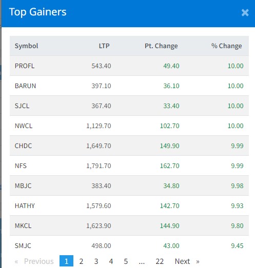 काठमाडौं । आज शेयर बजार नेप्से परिसूचक ३५ दशलमव ५५ अंकले बढेर २,६९६ को विन्दुमा कायम भएको छ । आज १८९ कम्पनीको शेयर मूल्य बढेको छ भने ४७ कम्पनीको मूल्य घटेको छ । आज सबैभन्दा धेरै प्रोग्रेशिभ फाइनान्स, बरुण हाइड्रोपावर, साञ्जेन जलविद्युत र नेपाल वेयरहाउजिङका लगानीकर्ताले कमाएका छन् । आज यी ४ कम्पनीका लगानीकर्ताले १० प्रतिशतका दरले कमाएका छन् । सिइडिबी हाइड्रोका लगानीकर्ताले ९ दशलमव ९९ प्रतिशतका दरले कमाएका छन् ।