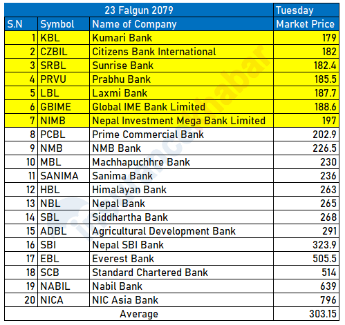 कुमारी बैंक, सिटिजन्स बैंक, सनराइज बैंक, प्रभु बैंक, लक्ष्मी बैंक, ग्लोबल आइएमई बैंक र नेपाल इन्भेष्टमेन्ट मेगा बैंकको शेयर मूल्य २०० रुपैयाँ भन्दा कम छ । त्यस्तै २० वाणिज्य बैंकको औसत मूल्य ३०३ रुपैयाँ छ ।