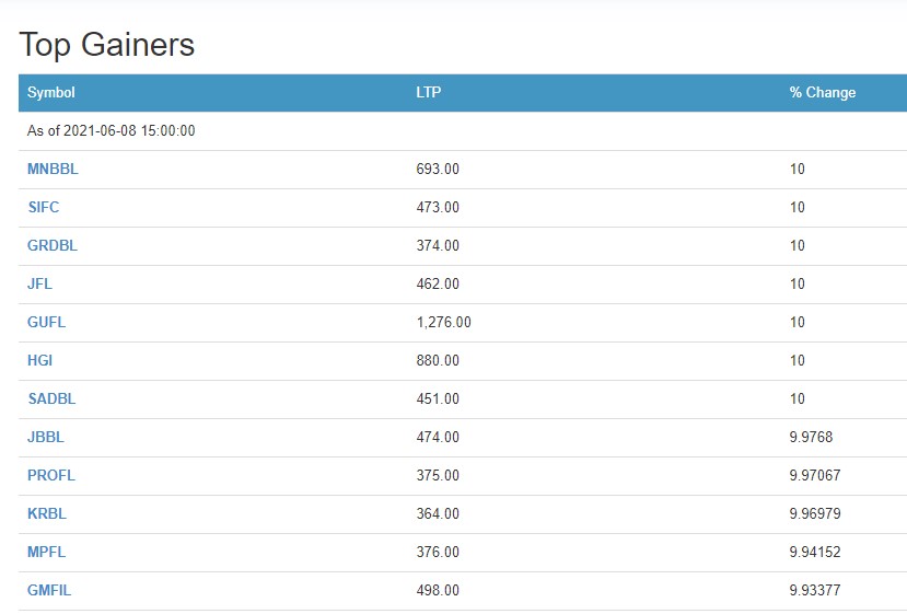 हिमालयन जनरल इन्स्योरेन्स , गोर्खाज फाइनान्स, श्री इन्भेष्टमेन्ट फाइनान्स, जानकी फाइनान्स, साग्रीला डेभलपमेन्ट बैंक, मुक्तिनाथ विकास बैंक र ग्रिन डेभलपमेन्ट बैंकको शेयर १० प्रतिशतले बढेको छ।