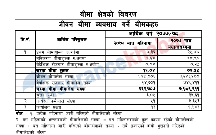 समितिको अनुसार माघ मसान्तसम्ममा ३९ वटा बीमा कम्पनीहरुले ९७ लाख ६४ हजार ४९ वटा बीमा पोलिसी जारी गरेका छन् । जसमध्ये १७ लाख ७४ हजार १ सय ३८ वटा बीमालेख निर्जीवन बीमा कम्पनीहरुले जारी गरेका छन् भने ७९ लाख ८९ हजार ९ सय ११ वटा बीमालेख जीवन बीमा कम्पनीहरुले जारी गरेका छन् ।