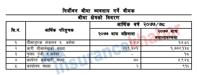 जीवन बीमा कम्पनीको हकमा भने प्रथम बीमा शुल्क वापत कम्पनीले माघ मसान्तसम्ममा २५ अर्ब ४० करोड रुपैयाँ, नविकरण बीमा शुल्क मार्फत ४८ अर्ब ९० करोड रुपैयाँ र वैदेशिक रोजगार बीमा शुल्क २५ करोड रुपैयाँ गरी कुल ७४ अर्ब ५५ करोड रुपैयाँ कुल बीमा शुल्क आर्जन गरेको हो ।