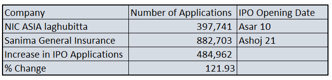 अहिले भर्खरै सानिमा लाईफ इन्स्योरेन्सको आईपीओको आवेदकको संख्यालाई आधार मान्दा ८ लाख ८२ हजार ७ सय ३ लगानीकर्ताले आवेदन दिएका थिए ।  यसको अर्थ यो तीन महिनाको अवधिमा नै आवेदन दिने लगानीकर्ताको संख्या दोब्बरले वृद्धि भएको छ। असार महिना देखि असोजमहिना सम्म आउँदा आईपीओमा आवेदन दिनेको संख्या करिव  ४ लाख ८४ हजारले वृद्धि भएको छ ।