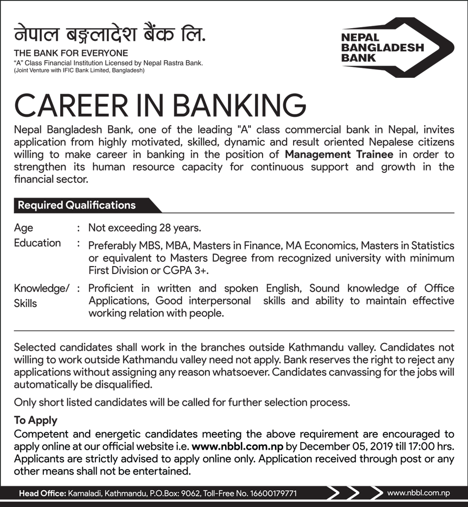 नेपाल बंगलादेश बैंकले व्यवस्थापन प्रशिक्षार्थी मागेको छ । बैंकले उक्त पदका लागि केही संख्यामा कर्मचारीको माग गरिएको जनाएको छ । उमेर हद भने २८ वर्ष तोकिएको छ । एप्लाई गर्ने म्याद डिसेम्बर ५ सम्म रहेको समेत सूचनामा उल्लेख गरेकमो छ ।