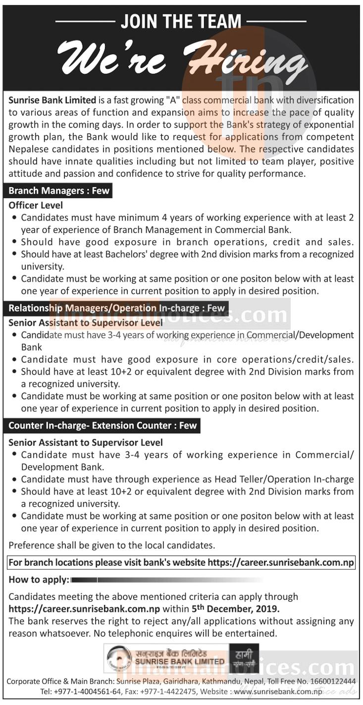 त्यसैगरी सनराइज बैंकले ब्रान्च मेनेजर, रिलेसनसिप मेनेजर वा अपरेसन इन्चार्ज र एक्स्टेन्सन काउन्टर इन्चार्जका लागि कर्मचारीको माग गरेको छ । ईच्छुक तथा योग्यता पुगेकाले डिसेम्बर ५ सम्म आवेदन दिन सक्ने बैंकले जनाएको छ ।