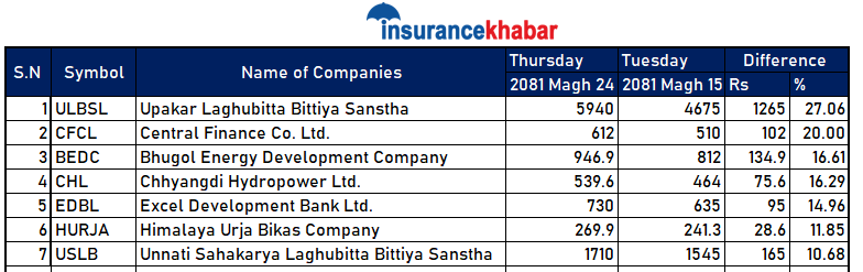 यो साता उपकार लघुवित्त वित्तीय संस्था लिमिटेडको शेयर मूल्य २७.०६ प्रतिशतले वृद्धि भएको छ । गत साता ४६७५ रुपैयाँमा बन्द भएको कम्पनीको बजार मूल्य यो साता ५९४० रुपैयाँमा बजार मूल्य बन्द भएको छ । यो साता कम्पनीको बजार मूल्य प्रति कित्ता १२६५ले बढेको छ ।