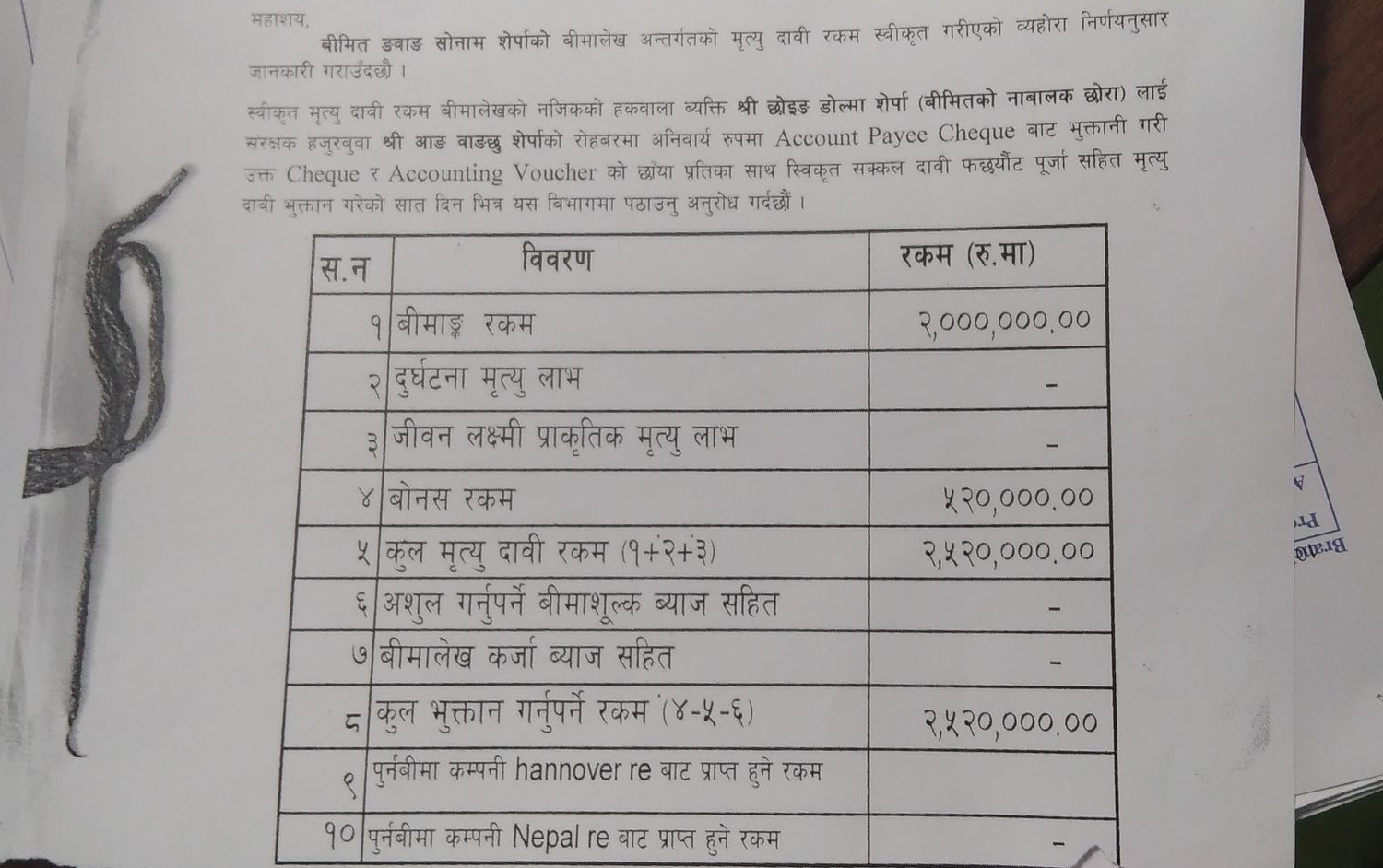 नेपाल लाईफ इन्स्योरेन्समा चार वर्ष पहिले २० लाख बिमाङ्कको नौलो जीवन समृद्धि बीमा पोलिसी लिई जीवन बीमा गरेको शेर्पाको मृत्यु भएपनि उनको छोरीहरुको शिक्षा दिक्षामा अब कुनै समस्या नपर्ने भएको छ । बीमा गरेर नियमित रुपमा बीमा शुल्क बुझाउँदै आएका शेर्पाकी उनै नाबालक छोरीको नाममा नेपाल लाईफ इन्स्योरेन्स कम्पनीले आज २५ लाख २० हजार रुपैयाँको चेक हस्तान्तरण गरेको हो । नाबालक भएकोले छोरीको चेक मृतका बाबु तथा हकवालाकी हजुरबुवा आङ वाङ्छु शेर्पाले बुझेका छन् ।