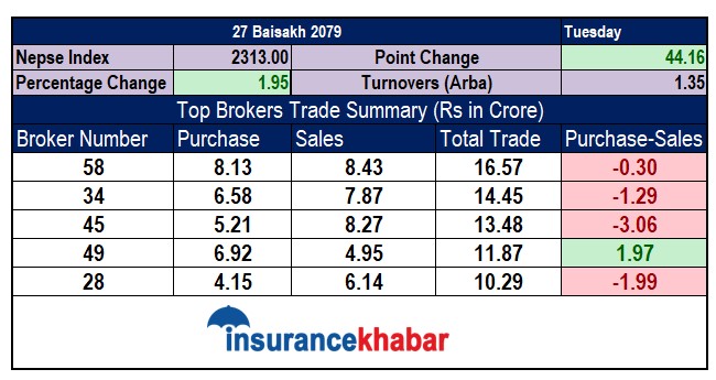 आज सबै भन्दा धेरै कारोवार ब्रोकर नम्बर ५८ बाट कारोवार भएको छ भने दोश्रोमा ३४ नम्बर ब्रोकरबाट धेरै कारोवार भएको छ । ब्रोकर नम्बर ५८ बाट ८ करोड १३ लाख बराबरको शेयर खरिद हुँदा ८ करोड ४३ लाख बराबरको शेयर बिक्री भएको छ। ब्रोकर नम्बर ५८ बाट खरिद भन्दा ३० लाख धेरै बिक्री भएको छ।
