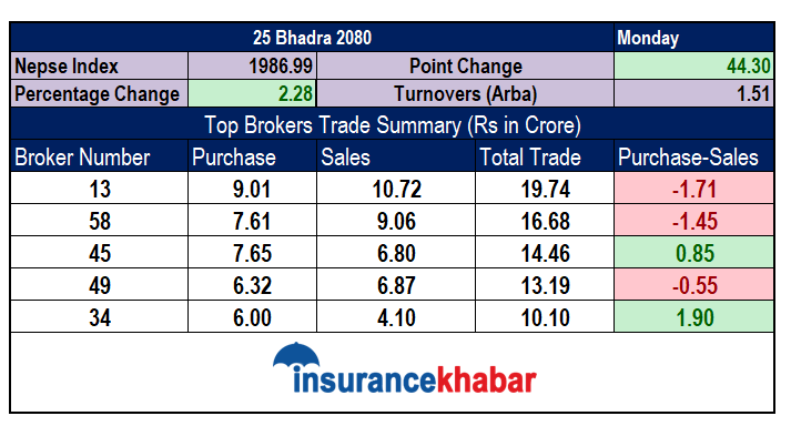 सोमावरको फ्लोरसिट हेर्दा ब्रोकर नम्बर १३ ले सर्वाधिक कारोवार गरेको छ । ब्रोकर नम्बर १३ बाट ९ करोड १ लाखको खरीद हुँदा १० करोड ७२ लाखको विक्री भएको छ । त्यस्तै दोश्रोमा ब्रोकर नम्बर ५८ ले सर्वाधिक रकमको कारोबार गरेको छ । ब्रोकर नम्बर ५८ बाट ७ करोड ६१ लाखको खरिद हुँदा ९ करोड ६ लाखको विक्री भएको छ ।