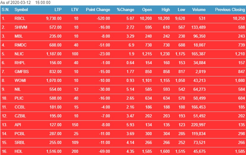 कारोबारमा आएका सबै समूह ओरालो लागेको छ । निर्जिवन बीमाको समूह सबैभन्दा बढी अंकले घटेको छ भने, जीवन बीमा २३७ अकंले घटेको छ ।नेपाल लाइफ इन्स्योरेनस कम्पनीले सबैभन्दा धेरै १९ करोड ८२ लाख रुपैयाँ बराबरको शेयर कारोबार गरेको छ । त्यस्तै, एनआईसी एशिया बैंकले १ करोड १६ लाख रुपैयाँ बराबरको शेयर कारोबार गरेको छ ।