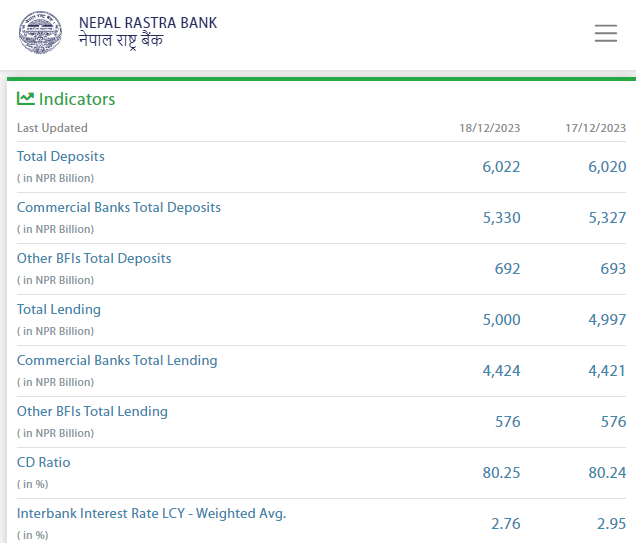 पुष २ गतेसम्म बैंकहरुको निक्षेप संकलन ६० खर्ब २२ अर्ब पुगेको छ । सिडी रेसियो ८० दशमलव २५ प्रतिशत हुँदा अन्तर बैंक ब्याज दर २ दशमलव ७६ प्रतिशत रहेको छ । अघिल्लो दिन भन्दा अन्तर बैंक ब्याज दर भने केही घटेको छ। अघिल्लो दिन अन्तर बैंक ब्याज दर २ दशमलव ९५ प्रतिशत थियो ।