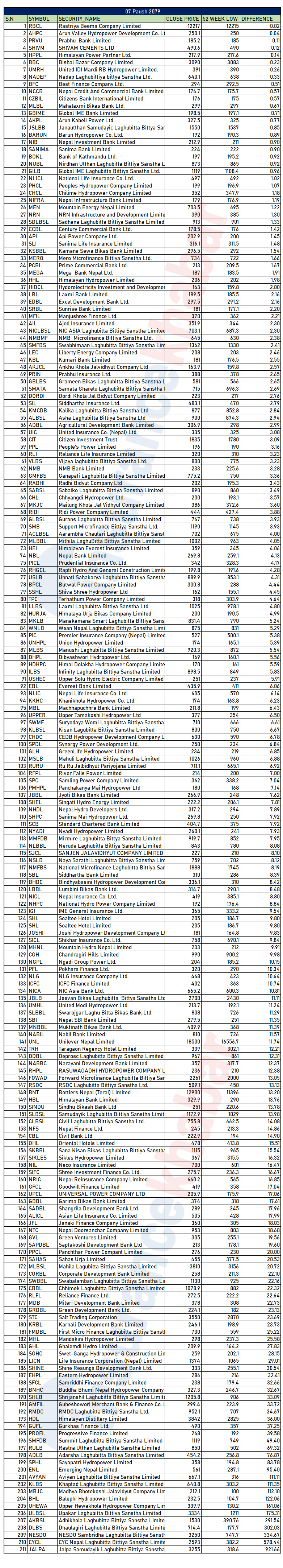 तेश्रोमा प्रभु बैंक रहेको छ । बैंकको ५२ हप्ताको न्यून मूल्य १८५ रहेकोमा हालको बजार मूल्य रु. १८५ दशमलव २० छ । सूचीकृत शेयर मध्ये २१ कम्पनीको शेयरमूल्य ५२ हप्ताको न्यून विन्दुमै छन् भन्दा फरक नपर्ने अवस्था छ ।(नोट : तलको तालिकामा फरक प्रतिशतमा देखाईएको छ)