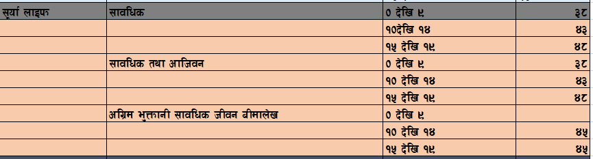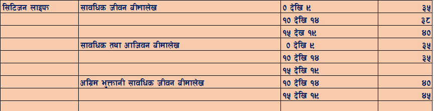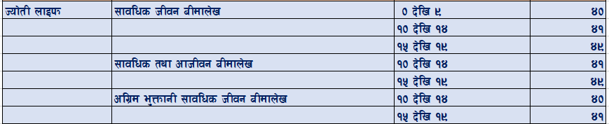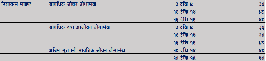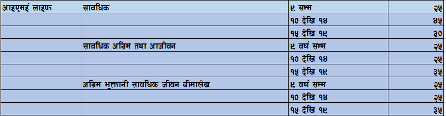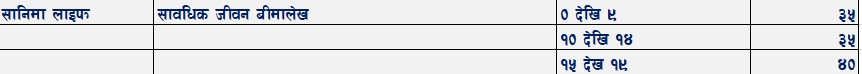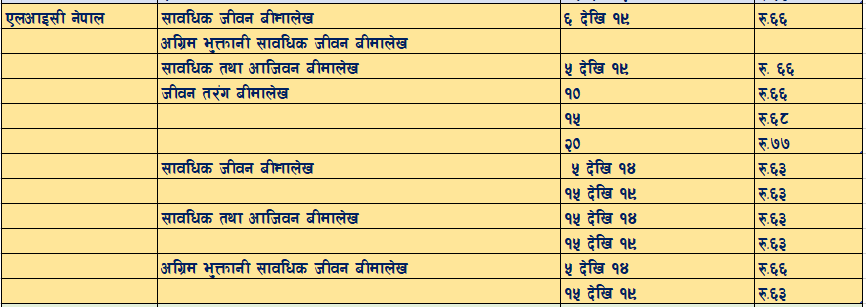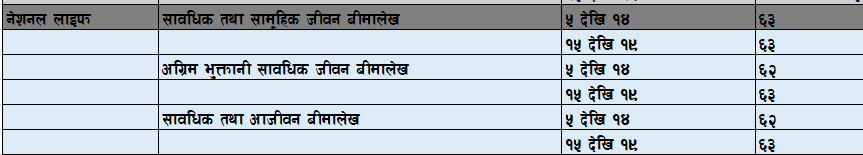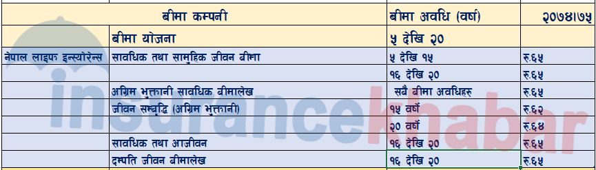 त्यस्तै, नेपाल लाइफ इन्स्योरेन्स कम्पनीले भने ५ वर्षदेखि १५ वर्ष र १६ देखि २० वर्षसम्मको सावधिक तथा सामुहिक जीवन बीमा बीमालेखका लागि ६५ रुपैयाँ बोनस दर कायम गरेको छ । यस्तै, कम्पनीले अग्रिम भुक्तानी सावधिक बीमालेख अन्तर्गतका सबै बीमा अवधिहरुमा ६५ रुपैयाँ बोनस दर कायम गरेको छ ।
