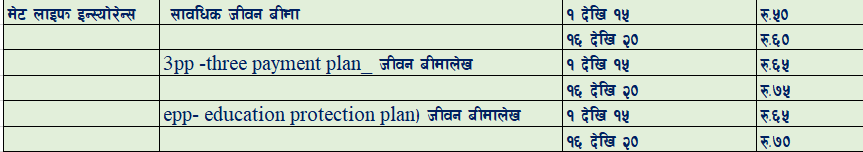 मेट लाइफले थ्री पेमेन्ट प्लान अन्तर्गत १६ देखि २० वर्षे बीमा अवधिका लागि ७५ रुपैयाँ बोनस दर कायम गरेको छ । यस्तै मेटले इपीपी एजुकेशन प्रोड्क्शन प्लान अन्तर्गत १६ देखि २० वर्षे बीमा अवधिका लागि ७० रुपैयाँ बोनस दर कायम गरेको छ ।
