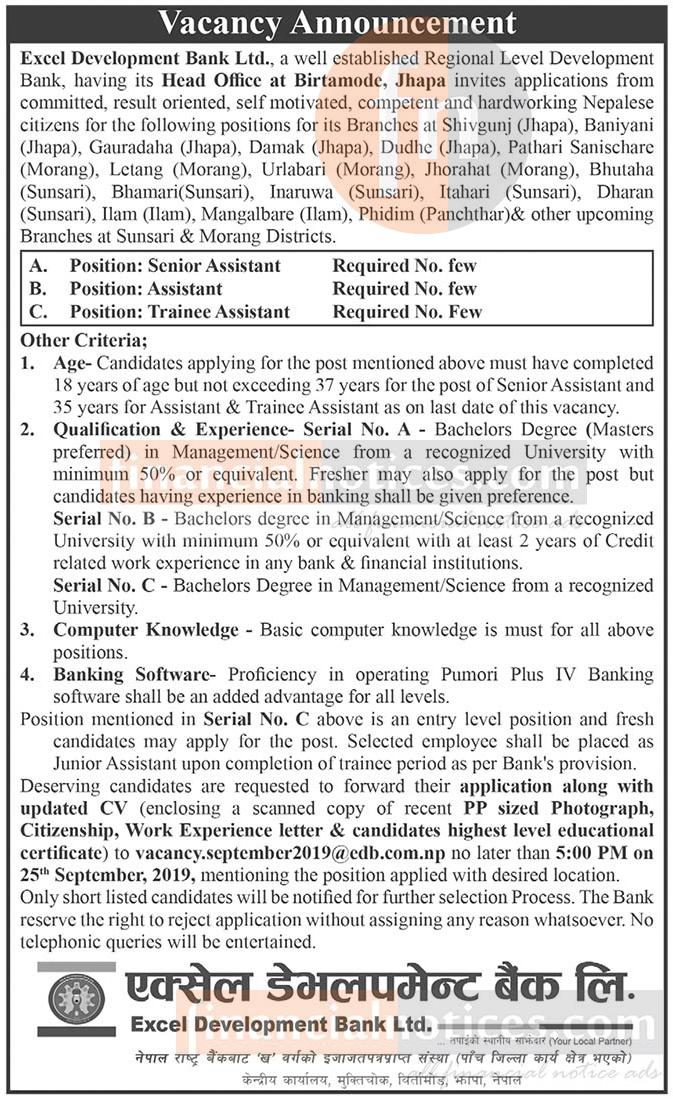 त्यस्तै, एक्सेल डेभलपमेन्ट बैंकले पनि विभिन्न पदका लागि कर्मचारी माग गरेको छ । बैंकले सिनियर एसिस्टेन्ट, एसिस्टेन्ट र ट्रेनी एसिस्टेन्ट पदका लागि केही कर्मचारी माग गरेको हो ।