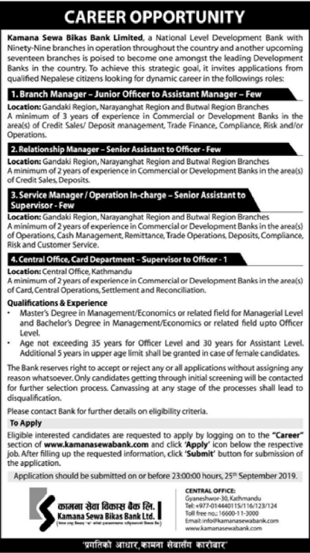इच्छुक तथा योग्यता पुगेका आवेदकले २५ सेप्टेम्बरसम्म आवेदन दिन सक्ने बैंकले जनाएको छ ।