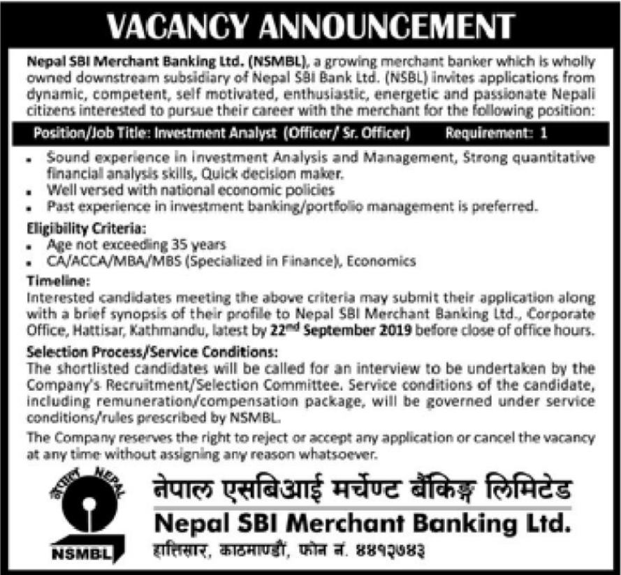 त्यस्तै, नेपाल एसबिआई मर्चेण्ट बैंकिङ्ग लिमिटेडले पनि विभिन्न पदका लागि कर्मचारी माग गरेको छ । बैंकले अफिसर÷ सिनियर अफिसर पदका लागि १ जना कर्मचारी माग गरेको हो ।