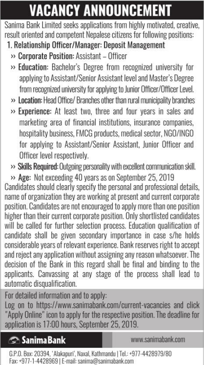 सानिमा बैंकले पनि विभिन्न पदका लागि कर्मचारी माग गरेको छ । बैंकले डिपोजिट म्यानेजमेन्ट र एसिस्टेन्टदेखि अफिसर लेवलका रिलेसनसिप अफिसर वा म्यानेजर पदका लागि कर्मचारी माग गरेको छ ।