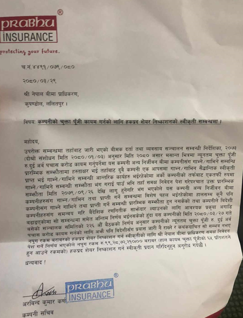नेपाल बीमा प्राधिकरणले २०८० असार मसान्तभित्रमा निर्जीवन बीमा कम्पनीहरुलाई न्युनत्तम चुक्ता पूँजी २ अर्ब ५० करोड पुर्याउनुपर्ने व्यवस्था गरेको थियो । मर्जरकाे प्रारम्भिक सम्झाैता भंग भएकाे र अन्य कुनै निर्जीवन बीमकसँग मर्जरका लागी हालसम्म कुनै सहमति जुट्न नसकेकाे जिकीर गर्दै प्रभु इन्स्याेरेन्सले हकप्रद शेयर निष्काशनका लागी नियामक प्राधिकरणसँग स्वीकृति मागेकाे छ।