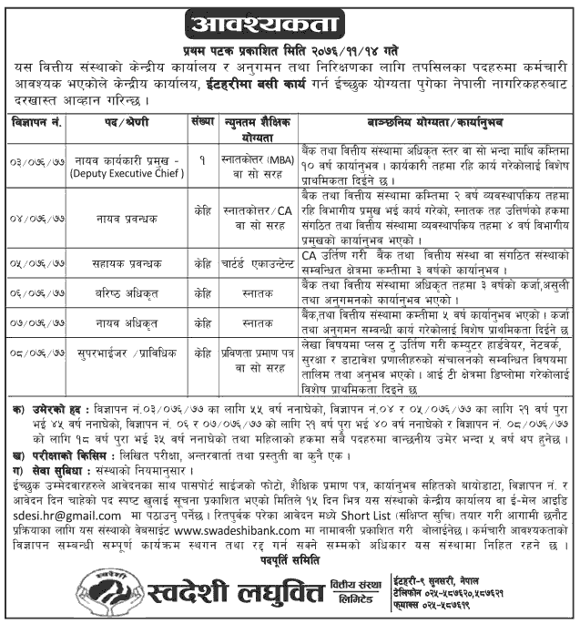 काठमाडौं । स्वदेशी लघुवित्त वित्तीय संस्थाले विभिन्न पदका लागि कर्मचारीको माग गरेको छ । संस्थाले नायब कार्याकारी प्रमुखका लागि १ जना, नायव प्रबन्धकका लागि केही, सहायक प्रबन्धकका लागि केही, वरिष्ठ अधिकृतका लागि केही, नायव अधिकृतका लागि केही र सुपरभाएजरका लागि केही संख्यामा कर्मचारीको माग गरेको हो ।