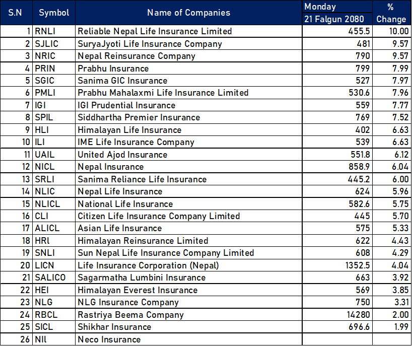 नेप्सेमा सूचीकृत बीमा कम्पनीमध्ये रिलायबल नेपाल लाइफको शेयर मूल्य सर्वाधिक १० प्रतिशतले वृद्धि भएको छ । त्यस्तै दोश्रोमा सुर्यज्योति लाइफको बजार मूल्य ९ दशमलव ५७ प्रतिशतले वृद्धि भएको छ । त्यस्तै नेपाल पुनर्बीमा कम्पनीको शेयर मूल्य ९ दशमलव ५७ प्रतिशतले वृद्धि भएको छ ।