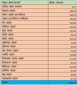 बीमा कम्पनीहरुले हरेक त्रैमाशिक वित्तीय विवरण तयार पार्दा कर तिर्न बाँकी मुनाफाको १० प्रतिशत कर्मचारीहरुका लागि छुट्टाउनु पर्छ । यहि व्यवस्था अनुसार दोस्रो त्रैमाशिक अवधिसम्मको मुनाफाबाट कम्पनीहरुले कर्मचारीहरुका लागि २८ करोड ६ लाख रुपैयाँ बोनस वितरणका लागि छुट्टाएका हुन् ।