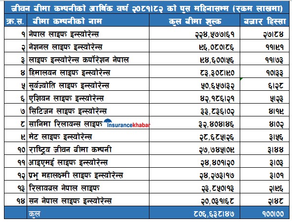 सूर्यज्योति लाइफले ५ अर्ब ६ करोड रुपैयाँ कुल बीमाशुल्क संकलन गरेको छ । एशियन लाइफले ४ अर्ब २१ करोड रुपैयाँ कुल बीमाशुल्क संकलन गरेको छ । सिटिजन लाइफले ३ अर्ब ३८ करोड रुपैयाँ कुल बीमाशुल्क संकलन गरेको छ । सानिमा रिलायन्स लाइफले ३ अर्ब २४ करोड रुपैयाँ कुल बीमाशुल्क संकलन गरेको छ ।