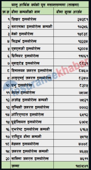समितिको तथ्याङक अनुसार ओरिएण्टल इन्स्योरेन्स कम्पनीले ६९ करोड १२ लाख रुपैयाँ, प्रुडेन्सियल इन्स्योरेन्स कम्पनीले ६७ करोड ९ लाख रुपैयाँ, एभरेष्ट इन्स्योरेन्स कम्पनीले ६१ करोड ६५ लाख रुपैयाँ, राष्ट्रिय बीमा कम्पनीले ५९ करोड १५ लाख, नेशनल इन्स्योरेन्स कम्पनीले ४७ करोड ७८ लाख रुपैयाँ, जनरल इन्स्योरेन्स कम्पनीले ४६ करोड ५५ लाख रुपैयाँ र सानिमा इन्स्योरेन्स कम्पनीले ४६ करोड ११ लाख रुपैयाँ कुल बीमा शुलक आर्जन गरेका छन् ।