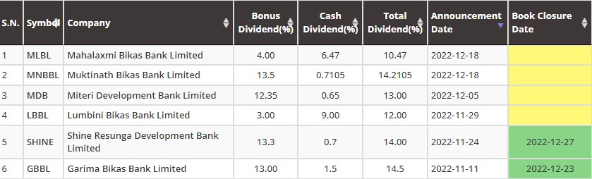 लाभांश प्रस्ताव गरेका विकास बैंकहरुमध्ये महालक्ष्मी विकास बैंक, मुक्तिनाथ विकास बैंक, मितेरी डेभलपमेन्ट बैंक र लुम्बिनी विकास बैंकले साधारण सभा तथा लाभांश प्रयोजनका लागि बुक क्लोज मिति तय गरेका छैनन् भने साइन रेसुङगा डेभलपमेन्ट बैंक र गरिमा विकास बैंकले बुक क्लोज मिति तय गरेका छन् ।