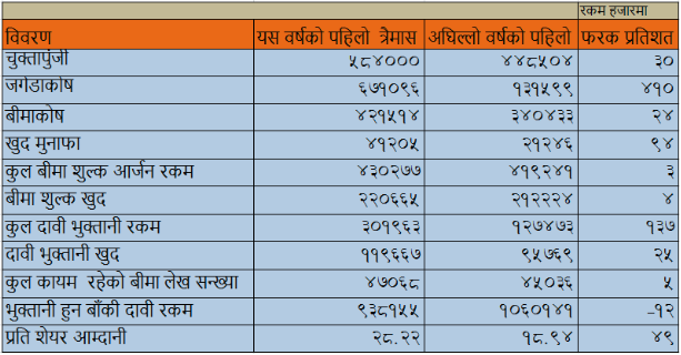 - यस त्रैमास सम्ममा कुल दावी भुक्त्तानी रकम १३७ प्रतिशतले वृद्धि भएर ३० करोड १९ लाख रहेको छ भने खुद दावी भुक्त्तानी ११ करोड ९६ लाख रहेको छ जुन अघिल्लो आर्थिक वर्ष भन्दा २५ प्रतिशतले धेरै हो भने ९३ करोड ८१ लाख दावी भुक्तानी गर्न बाँकी छ ।
