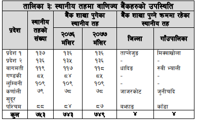 संघीय संरचना अनुसार बनाइएका ७ सय ५३ स्थानीय तहमध्ये हालसम्म ७४९ वटा स्थानीय तहमा वाणिज्य बैंकका शाखा स्थापना गरिसकेको राष्ट्र बैंकको पछिल्लो तथ्यांकले देखाएको छ। अब ४ स्थानीय तहमा मात्र बैंकका शाखा पुग्न बाँकि रहेको छ ।