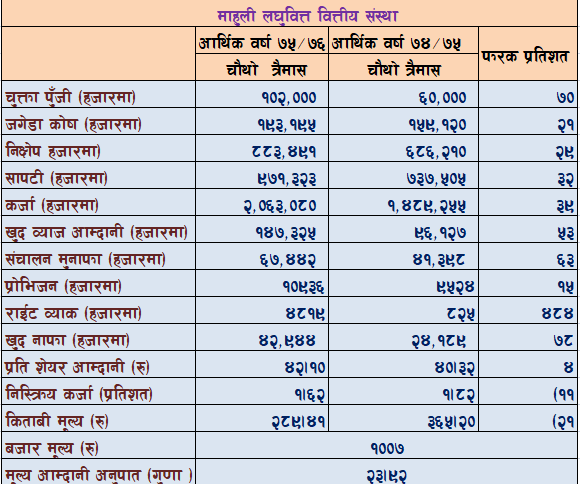 माहुली लघुवित्त वित्तीय संस्थाले आकर्षक वित्तीय विवरण प्रकाशन गरेको छ । गत आर्थिक वषको १२ महिनाको अवधिसम्म आइपुग्दा लघुवित्तको खुद नाफा ७८ प्रतिशतले बढेर ४ करोड २९ लाख रुपैयाँ कमाएको छ । अघिल्लो आर्थिक वर्षको यसै अवधिमा संस्थाले २ करोड ४१ लाख रुपैयाँ खुद नाफा कमाएको थियो ।