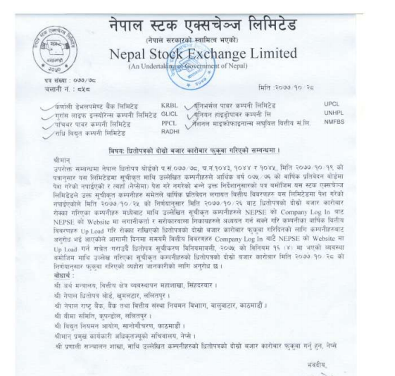 ्नेप्सेले कर्णाली डेभलपमेन्ट बैंक, युनिभर्सल पावर कम्पनी, गुराँस लाइफ इन्स्योरेन्स, युनियन हाइड्रो पावर, पाँचथर पावर कम्पनी, नेशनल माइक्रोफाइनान्स र राधि विद्युत कम्पनीको शेयर कारोबार फुकुवा गरेको एक सुचना प्रकाशित गर्दै जनाएको छ ।
