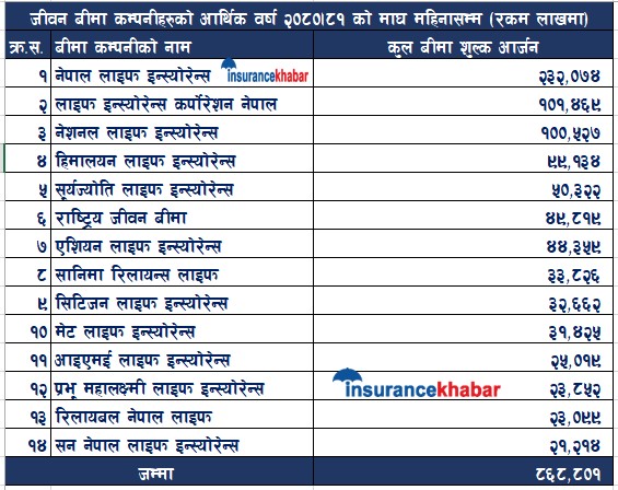 यस अवधिसम्ममा सबैभन्दा धेरै कुल बीमा शुलक नेपाल लाइफ इन्स्योरेन्स कम्पनीले संकलन गरेको छ । यस अवधिमा कम्पनीले २३ अर्ब २० करोड रुपैयाँ कुल बीमा शुल्क आर्जन गरेको छ । दोस्रोमा एलआइसी नेपाल रहेको छ । कम्पनीले यस अवधिमा १० अर्ब १४ करोड रुपैयाँ कुल बीमा शुल्क आर्जन गरेको छ । तेस्रोमा नेशनल लाइफ रहेको छ । कम्पनीले यस अवधिमा १० अर्ब ५ करोड रुपैयाँ कुल बीमा शुल्क आर्जन गरेको छ ।त्यस्तै, हिमालयन लाइफले ९ अर्ब ९१ करोड रुपैयाँ कुल बीमा शुल्क आर्जन गरेको छ । सूर्यज्योति लाइफले५ अर्ब ३ करोड रुपैयाँ कुल बीमा शुल्क आर्जन गरेको छ । राष्ट्रिय जीवन बीमा कम्पनीले ४ अर्ब ९८ करोड रुपैयाँ कुल बीमा शुल्क आर्जन गरेको छ । एशियन लाइफले ४ अर्ब ४३ करोड रुपैयाँ कुल बीमा शुल्क आर्जन गरेको छ । सानिमा रिलायन्स लाइफले ३ अर्ब ३८ करोड रुपैयाँ कुल बीमा शुल्क आर्जन गरेको छ ।