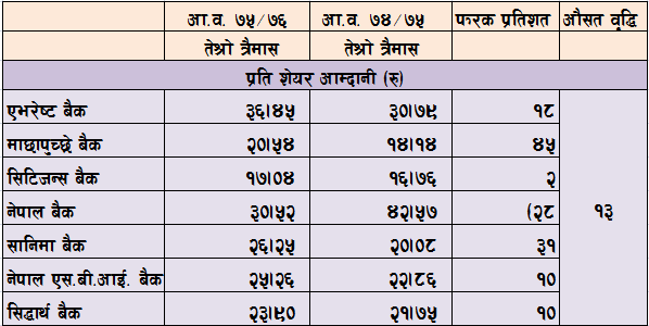 ७ वाणिज्य बैंकको प्रति शेयर आम्दानी औसतमा १३ प्रतिशतले वृद्धि भएको छ।माछापुच्छ्रे बैंकको प्रति शेयर आम्दानी ४५ प्रतिशतले वृद्धि गर्दै २० रुपैयाँ ५४ पैसा पुर्याएको छ। गत आर्थिक वर्षको तेश्रो त्रैमासमा बैंकको प्रति शेयर आम्दानी १४ रुपैयाँ १४ पैसा थियो। नेपाल बैंकको भने प्रति शेयर आम्दानी २८ प्रतिशतले कम हुँदै ३० रुपैया ५२ पैसा पुगेको छ।